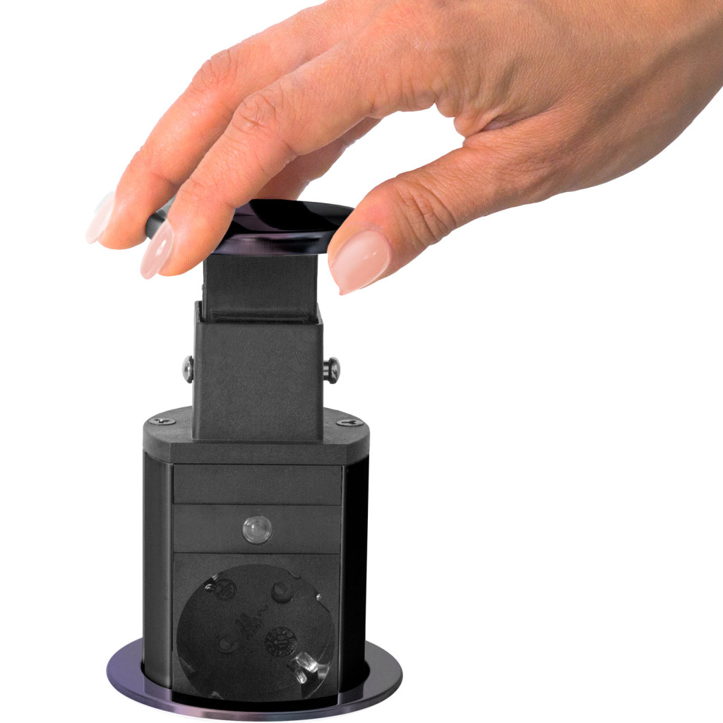 Süllyeszthető elosztó irodai és otthoni felhasználásra, fém házzal, 3 db gyermekvédelemmel ellátott aljzattal. Asztala, bútora legyen mindig elegáns és rendezett, mégis funkcionális. A rejtett elosztó kiváló megoldás lehet ha már például kész konyhával rendelkezik, de nincs elegendő konnektor a kívánt helyen. Ilyenkor falvésés és villamos hálózat bővítés nélkül, remek alternatíva lehet egy rejtett elosztó. Egy mozdulat és máris rendelkezésre áll 3 szabad konnektor. Ideális lehet olyan elektromos eszközökhöz, amit nem folyamatosan használunk, kenyérpirító, vízforraló... Ha használaton kívül vannak, a "töltőoszlop" egy mozdulattal elrejthető, ezzel is megkönnyítve például a takarítást, valamint rendezett, letisztult külsőt ad a helységnek.