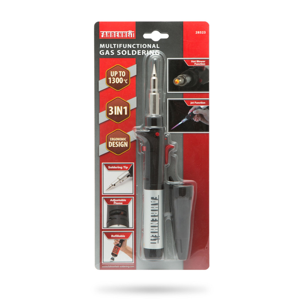 A Fahrenheit multifunkciós gázüzemű forrasztószett hatékonyan ötvözi a hőlégfúvó és a gázforrasztó ceruza tulajdonságait. Felhasználható különböző finomelektronikai forrasztások, hőlégfúvás, zsugorítás (zsugorcső), szúrólánggal történő hevítés munkálatokhoz. Ez a kompakt készülék rengeteg hasznos funkcióval rendelkezik: biztonsági kapcsoló, lángszabályzó, folyamatos láng kapcsoló, lángkioltó gomb, piezo gyújtórendszer. A forrasztópáka-hegy lecsavarásával használhatjuk hőlégfúvóként is. A gáztartály újratölthető ezáltal a készülék hosszú időnát használható.