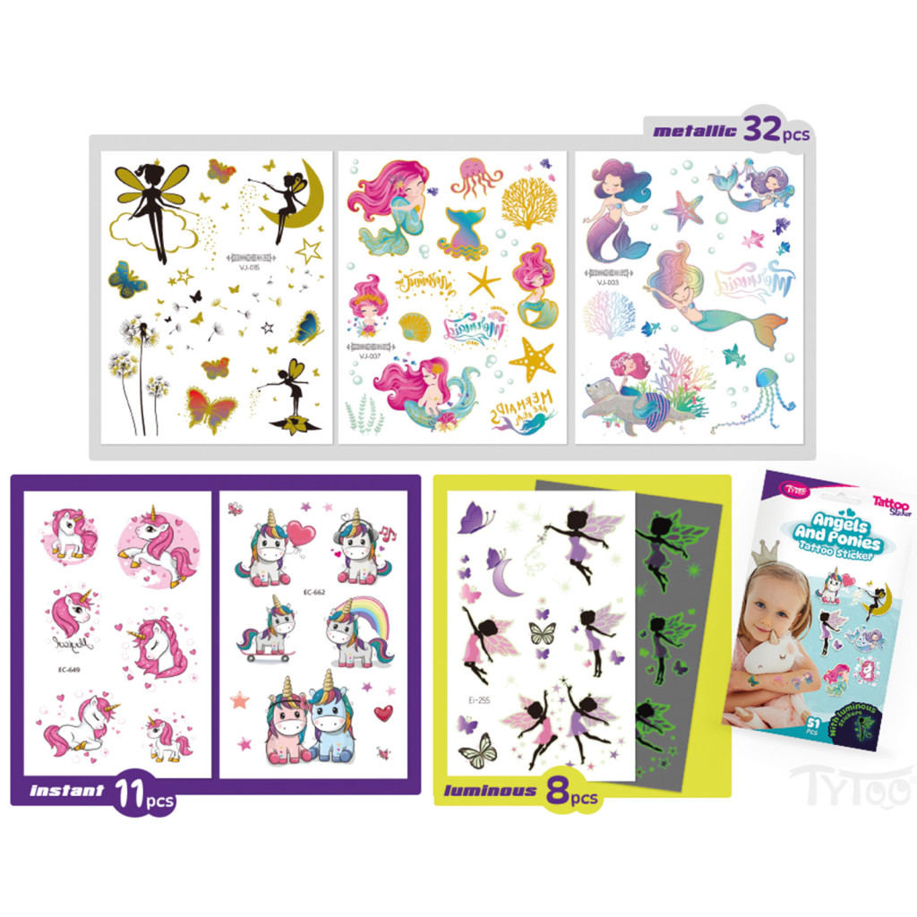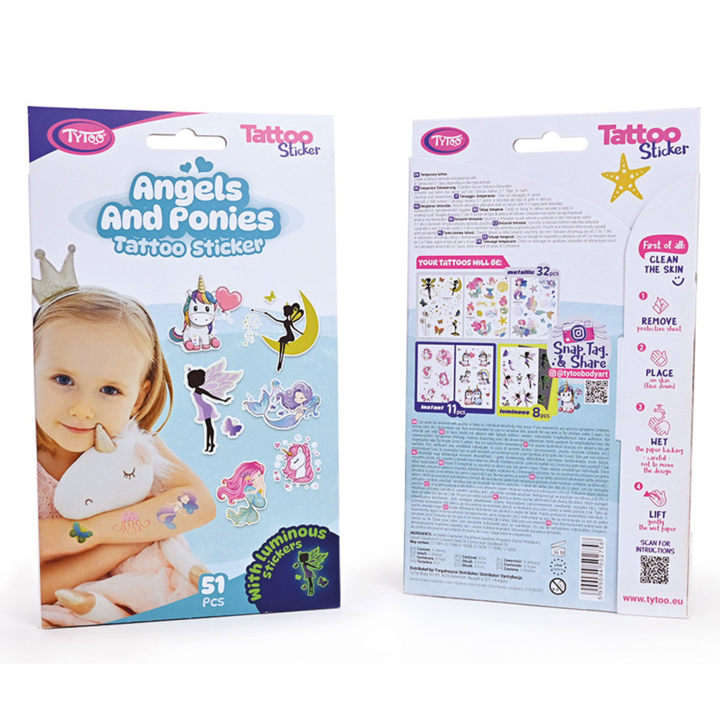 Minden ami Tündér vagy Póni! Könnyen felvihető, egyszerű és látványos tetkók, a legcukibb póni és tündér mintákkal, szettben. Ezek az ideiglenes tetoválás matricák kiváló minőségűek, így hosszabb ideig, napokig is megőrzik élénk színüket és részletgazdagságukat. Könnyen felhelyezhetőek és eltávolíthatóak, anélkül hogy irritálnák vagy károsítanák a bőrt. 51 db tetoválás 6 db íven