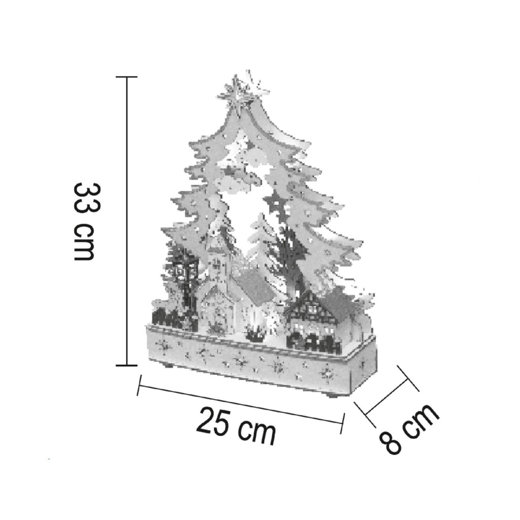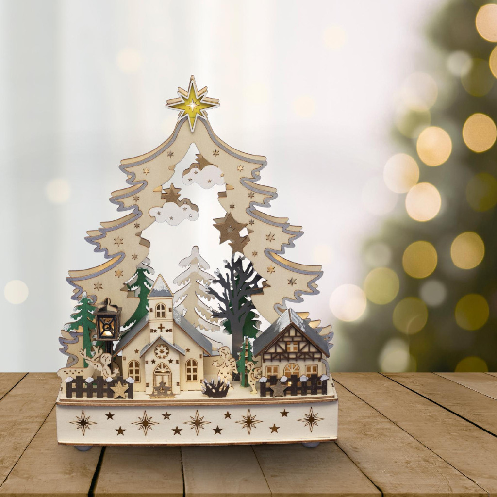 Ez a beltéri kivitelű asztali dísz egy gyönyörűen kidolgozott karácsonyi falu motívumot ábrázol, amelyet lézerrel kivágott, aprólékosan megmunkált fa elemek díszítenek. A falu melegfehér LED-ekkel világít, amelyek állandó fényt biztosítanak, így az ünnepi hangulat mindig jelen lesz. Összesen 12 LED gondoskodik a hangulatos világításról, amely egyszerűen be- és kikapcsolható. A termék 2 db 1,5 V-os AA elemmel működik (nem tartozék), így bárhol elhelyezhető a lakásban, anélkül, hogy konnektortól kellene függenie.