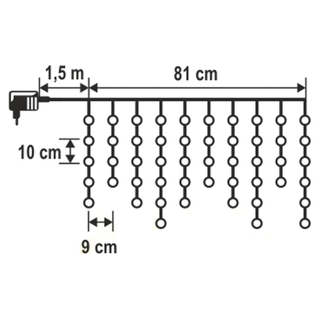 Ez a fényfüggöny 50 hidegfehér LED-ből áll, amely egyedülálló, tiszta fényt biztosít, így még varázslatosabbá teszi az ünnepi hangulatot. A fehér vezetékkel rendelkező fényfüggöny diszkréten simul a környezetbe, miközben a LED-ek ragyogása elbűvölő látványt nyújt. A LED-ek száma füzérenként változó (5/4/5/6/5/4/5/6/4/6), ami izgalmas és dinamikus megjelenést kölcsönöz a fényfüggönynek. A termék 230 V-os adapteres tápellátással működik, így könnyen és gyorsan üzembe helyezhető bármely beltéri helyiségben.