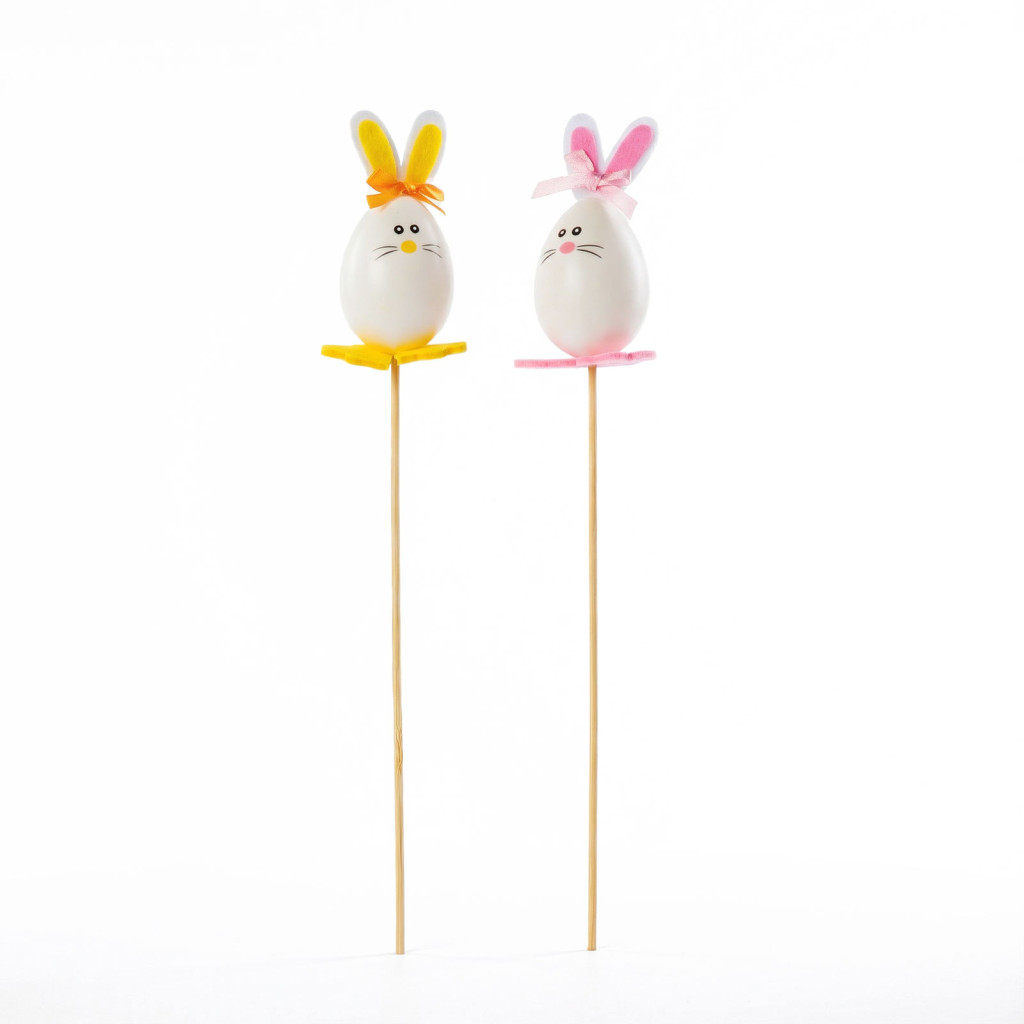 Tegye ünnepivé otthonát ezzel a bájos húsvéti dekorációval! A szett 2 darab, 33 cm hosszú pálcikás tojásfigurát tartalmaz, amelyek aranyos nyusziként vannak díszítve. A fehér tojás alakú testeket színes filcfülek (sárga és rózsaszín) és vidám masnik teszik különlegessé, így tökéletes kiegészítői lehetnek tavaszi kompozícióknak, virágcsokroknak vagy ünnepi asztaldíszeknek.