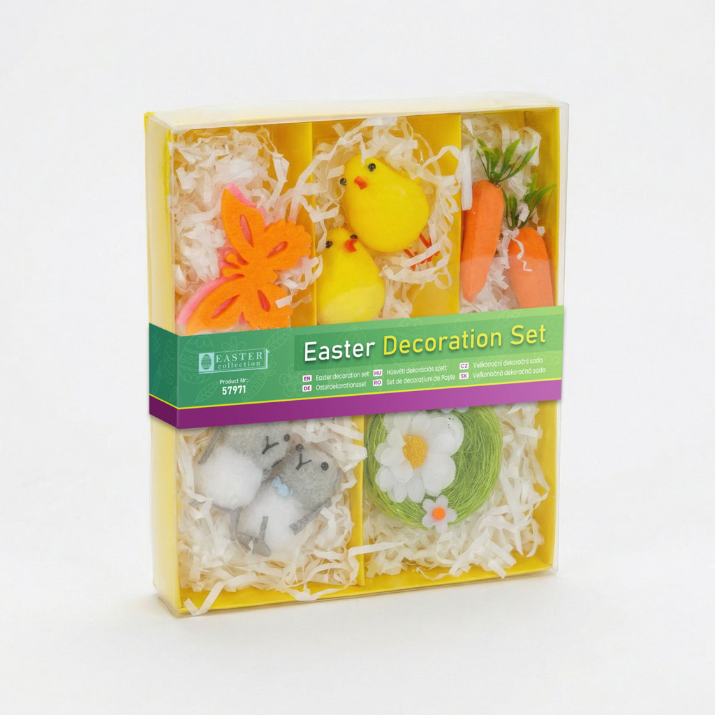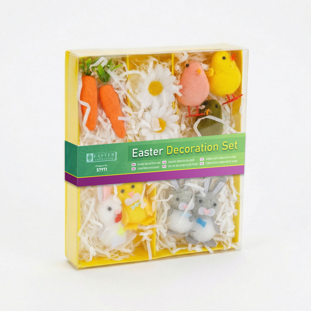 Teremtsen vidám, ünnepi hangulatot otthonában ezzel a bájos húsvéti dekorációs szettel! A szett különféle aranyos kiegészítőket tartalmaz, mint például nyuszik, csibék, répák, pillangók és virágdíszek, melyek tökéletesek kosarak, terítékek vagy kompozíciók díszítéséhez, összeállításához. A színes, részletgazdag elemek játékossá és hangulatossá varázsolják a lakást a tavaszi és húsvéti időszakban.