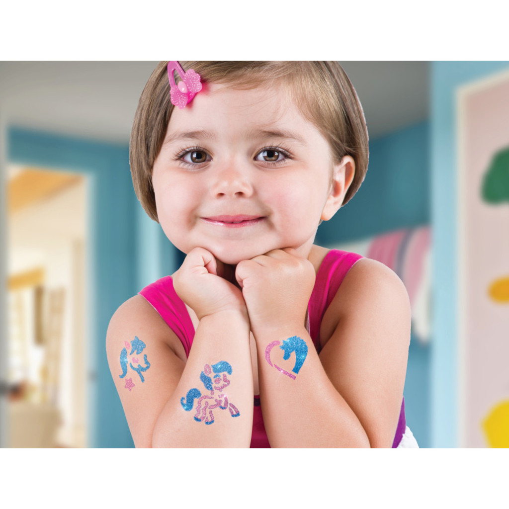 A csomagban található sablonok segítségével pónis, lovas, unikornisos csillámtetoválás mintákat készíthet, melyeket egyéb testfestéshez is felhasználhat. Ebben a csomagban olyan sablonokat talál, mint például pónis, lovas, unikornisos, melyekkel biztos örömöt szerez a gyerekeknek.