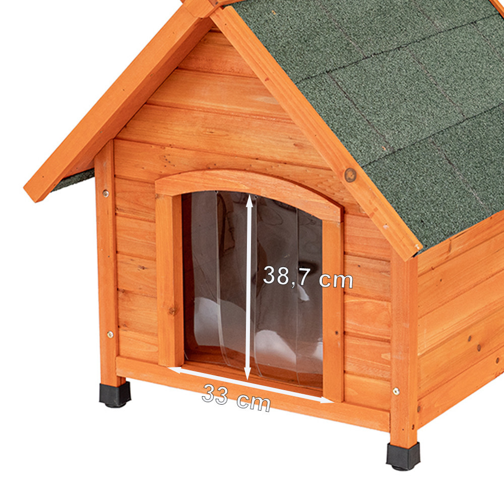 A kutyaház teteje tégla hatású, homokolt kátránypapírral van borítva, ami biztosítja az időjárásállóságot és extra védelmet nyújt. A széles tetőtúlnyúlások a külső oldalakat és a bejáratot is védik az esőtől, széltől és hidegtől. Az átlátszó lamellás ajtó ideális esős időben és véd a huzattól.